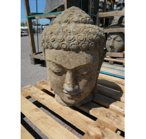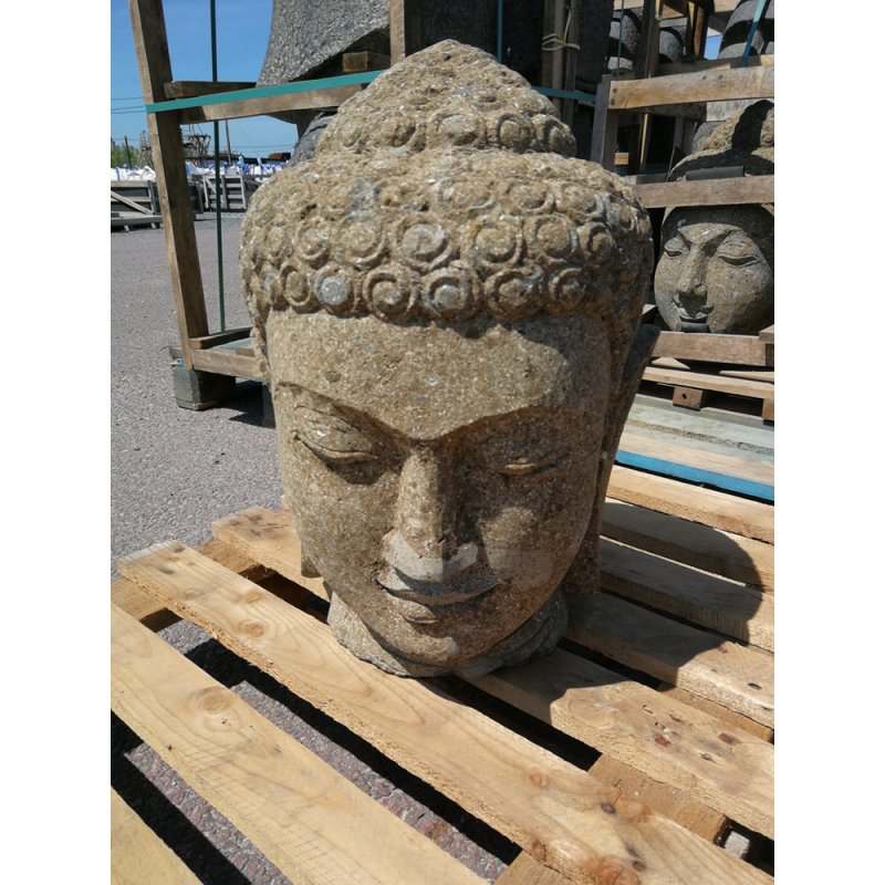 Statue tête de Bouddha en pierre de lave naturelle, disponible en 50, 100 et 150 cm. Élément décoratif robuste pour jardin ou intérieur, au style zen et authentique.