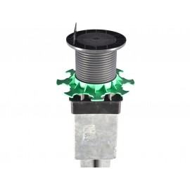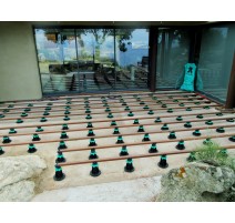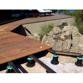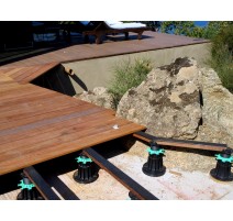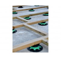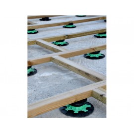 Grâce à un système de languette, les lambourdes viennent se positionner sur le plot et sont fixées régulièrement. A l'aide de leur molette de réglage, les plots pour lambourdes s'ajustent à la hauteur pour assurer la planéité de la terrasse.
